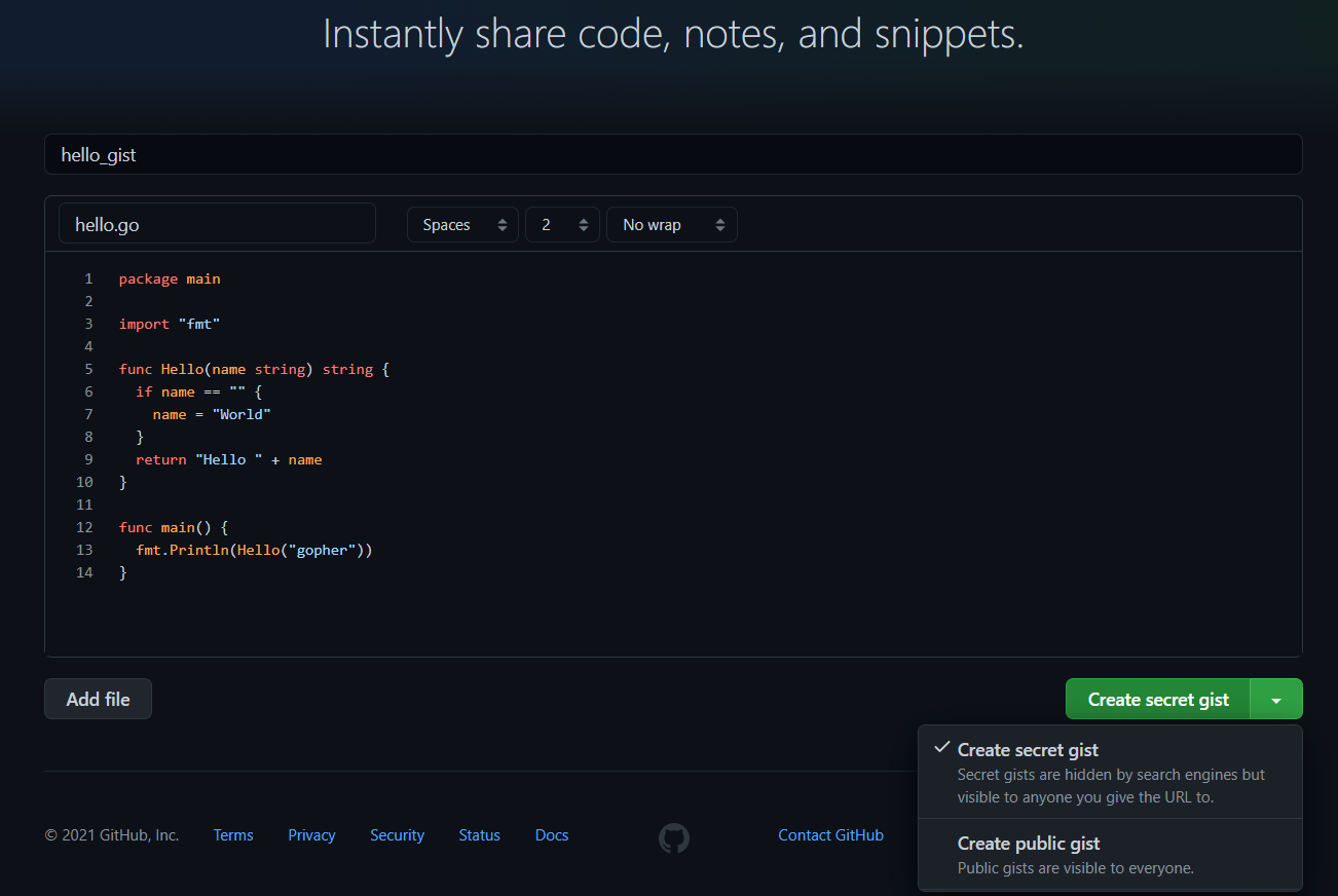 - secret gist : 검색에는 보여지지 않으나 url을 통해 누구든지 보여줄 수 있음